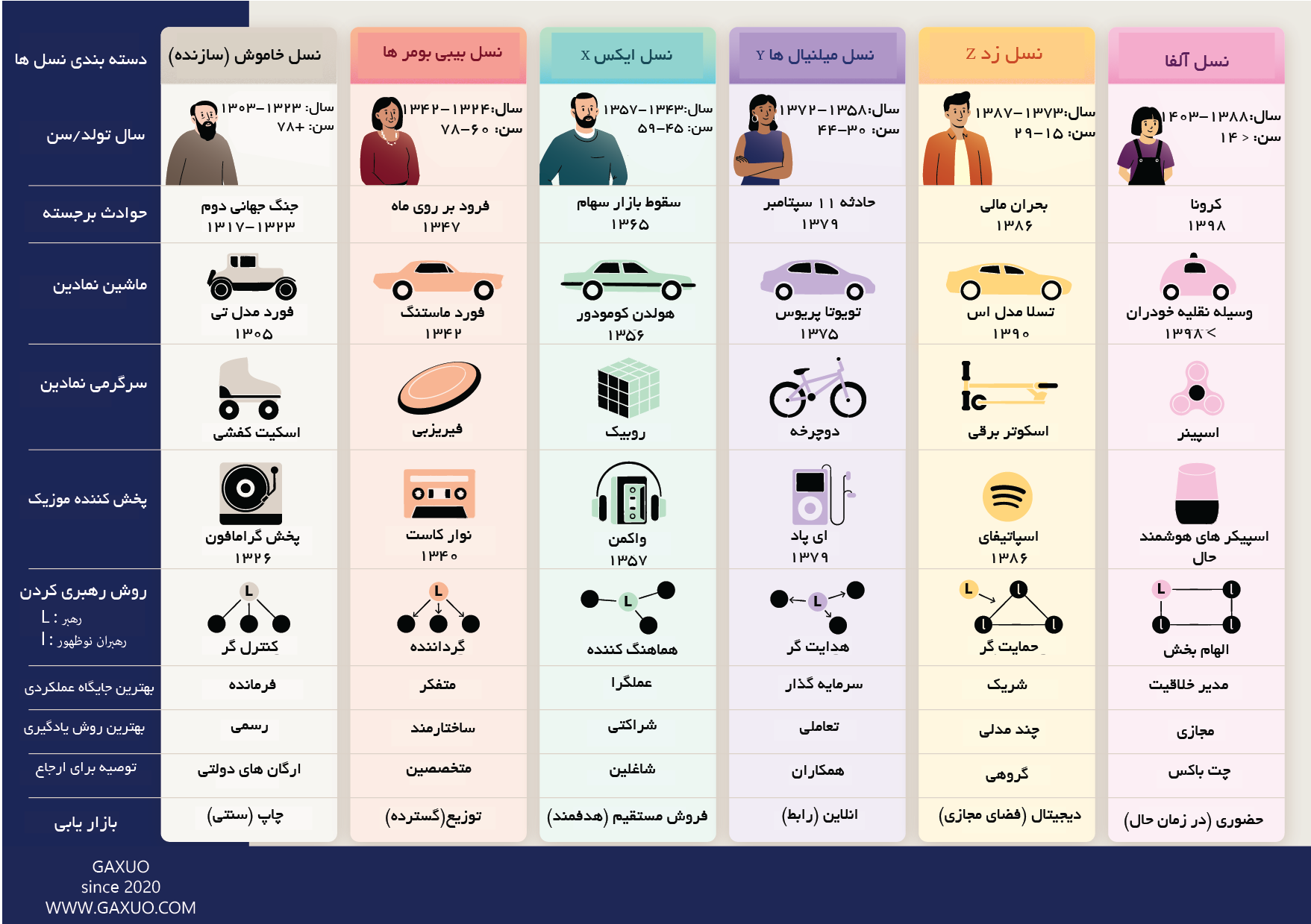 4.نسل زد (سده): این نسل اغلب در بین سال های1373 تا 1387 متولد شدهاند. – خصوصیات نسل Z یا جنریشن Z که به آنها همچنین “دیجیتال نیتیوز” یا “دیجیتال نیتیو” هم گفته میشود، با فناوریهای دیجیتال و اینترنت از زمان کودکی آشنا شدهاند. آنها به عنوان یک نسل دارای هویت چندفرهنگی و فناوریمحور شناخته میشوند و عمدتاً بر پایه ارتباطات آنلاین و رسانههای اجتماعی بزرگ شدهاند.